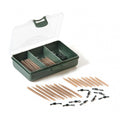 Een gevulde mini tacklebox van Extra Carp met quickchange wartels en Camo Anti Tangle Sleeves voor het maken van allerlei karper onderlijnen voor het vissen. De Anti-Tangle sleeves hebben een lengte van 40mm en 60mm. De Swivels zijn in maat #8, de standaard maat voor het karpervissen en te gebruiken met allerlei gangbare varianten Lood- & Leader Clips. Ideaal voor in de tacklebox van iedere karpervisser.